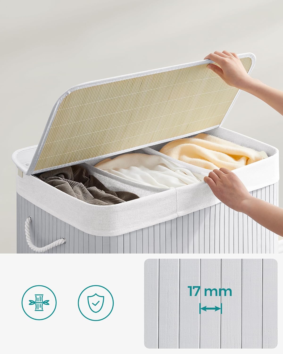 [Stevige en opvouwbare] Gemaakt van 17 mm brede bamboe latten en ondersteund door een metalen frame, is deze wasmand stabiel, stevig en kan tot 30 kg dragen. Dankzij de eenvoudige constructie kan hij gemakkelijk worden opgevouwen wanneer hij niet in gebruik is.