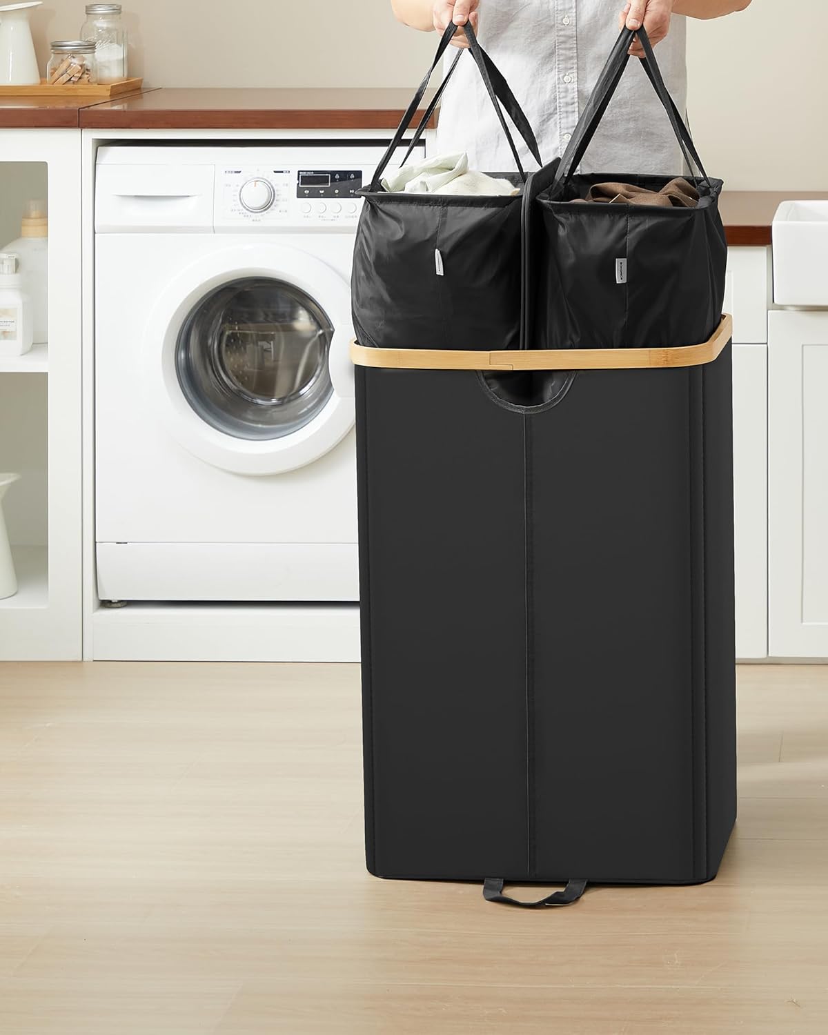 UITNEEMBARE BINNENZAKKEN: GEMAKKELIJK TE TRANSPORTEREN: Stap op de lus aan de onderkant om de zakken er gemakkelijker uit te halen. Vervolgens kunt u ze gemakkelijk naar de wasruimte vervoeren met de handvatten aan de zijkant.