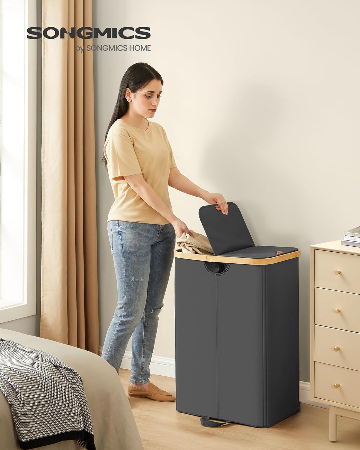Met een stijlvol deksel: Het symmetrische deksel geeft de mand een unieke touch, beschermt je wasgoed tegen stof en biedt privacy.