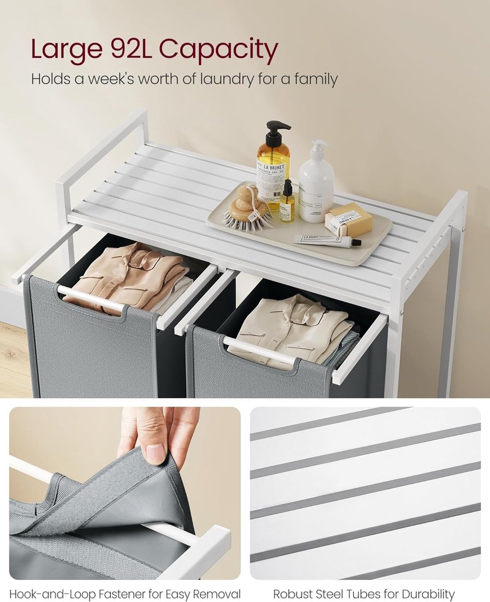 Deze wasmand heeft een totale capaciteit van 92 liter, waarbij elke voering 46 liter bevat. Dankzij het ontwerp met 2 compartimenten kunt u uw wasgoed op type ordenen en licht wasgoed van donker scheiden.
