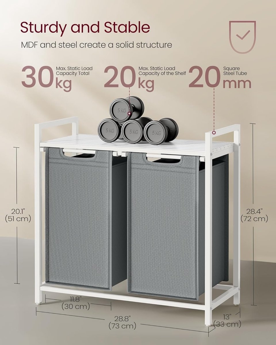 Deze wasmand is gemaakt met een frame van stalen buizen van 2 cm en een MDF-paneel en ondersteunt tot 20 kg op de bovenste plank. Bovendien is elke voering gemaakt van waterafstotend Oxford-materiaal en zorgen de vier verstelbare voetjes voor stabiliteit.