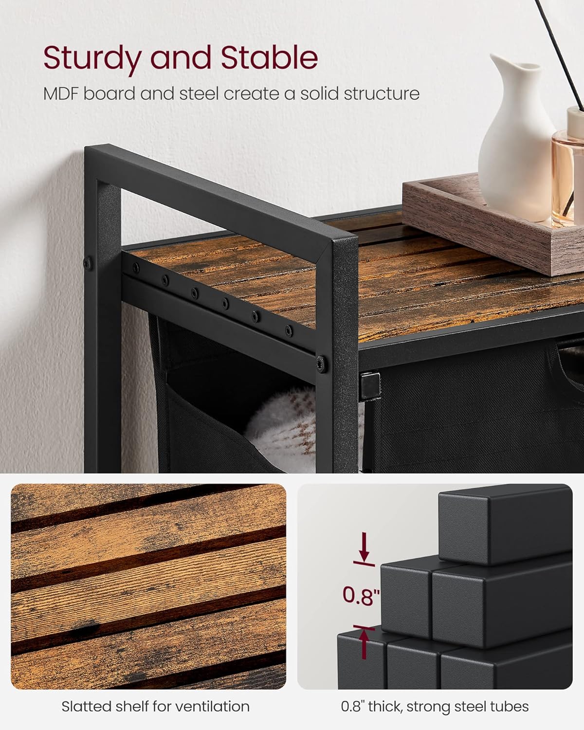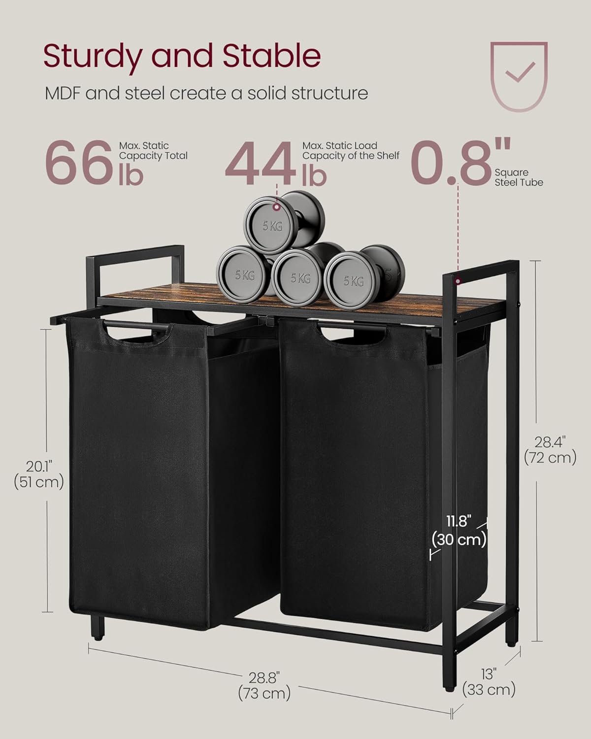 Deze wasmand is gemaakt met een frame van stalen buizen van 2 cm en een MDF-paneel en ondersteunt tot 20 kg op de bovenste plank. Bovendien is elke voering gemaakt van waterafstotend Oxford-materiaal en zorgen de vier verstelbare voetjes voor stabiliteit.