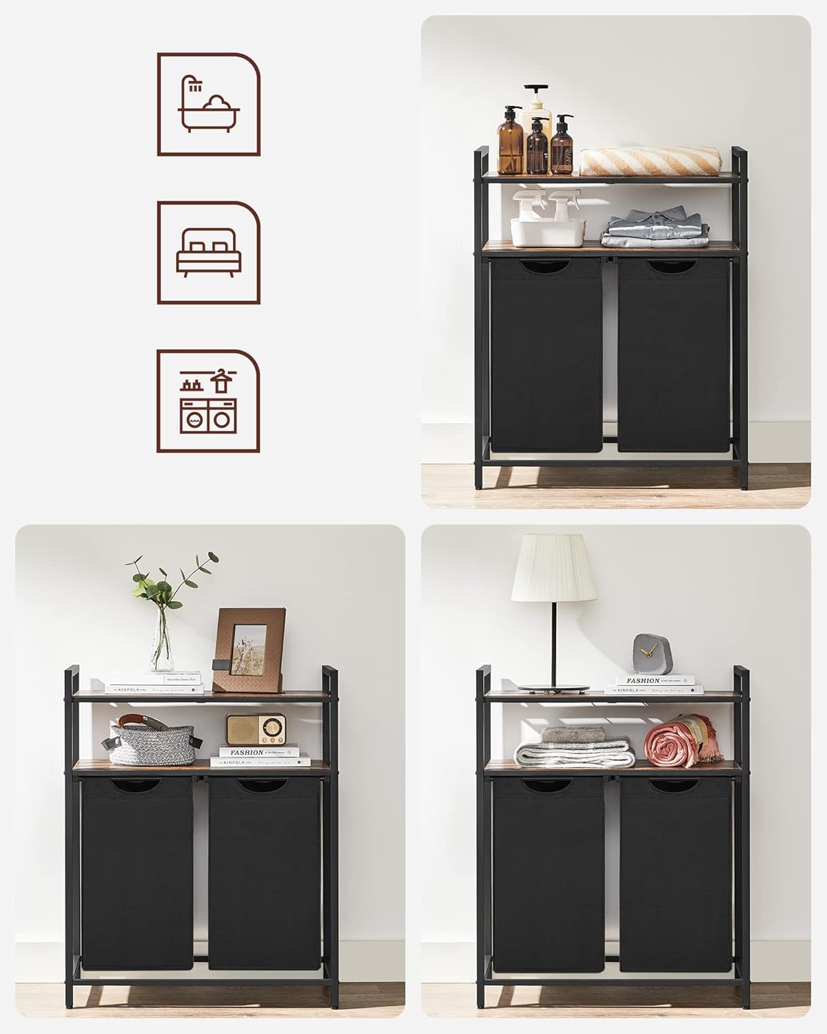 Praktisch en veelzijdig: deze wassorteerder is handig in je wasruimte, badkamer of slaapkamer. Het beschikt over 2 manden en 2 planken, zodat je rommel kunt verbergen en je wasgoed gemakkelijk kunt organiseren.