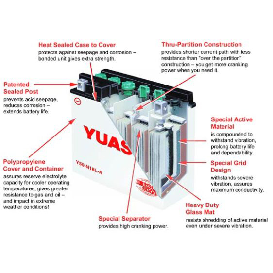 Yuasa is ’s werelds grootste leverancier van accu’s. Veel nieuwe motorfietsen worden afgeleverd met een accu van Yuasa. Dankzij de speciale dunne separators bevat iedere cel twee extra platen, dit vergroot het startvermogen van de accu met 30%. Hierdoor hebben de accu’s van Yuasa de beste prijs-kwaliteitverhouding.
