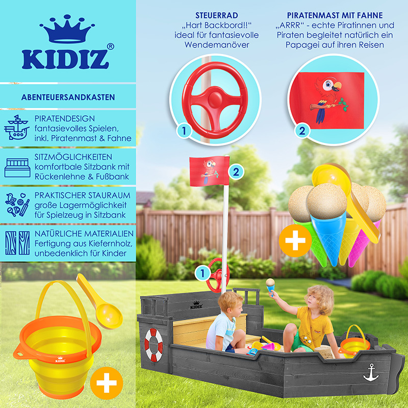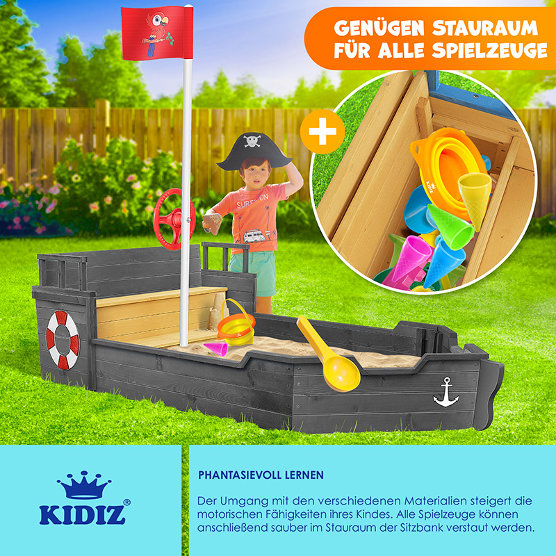 Zandbak Ahoy in piratendesign, inclusief piratenmast en vlag, comfortabele zitgelegenheid met bankje en rugleuning, praktische opbergruimte en gemaakt van natuurlijke materialen