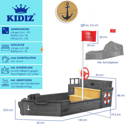 Dankzij het geïntegreerde opbergvak in de voetenbank is er voldoende opbergruimte voor speelgoed. Zo kunt u tuinspeelgoed zoals zandschepjes, zandschepjes en emmers netjes opbergen en blijft alles overzichtelijk. Met een breedte van 94 cm en een lengte van bijna twee meter biedt het speelcomfort volop ruimte voor uw kind en vriendjes. De piratenbemanning is klaar voor het volgende avontuur.