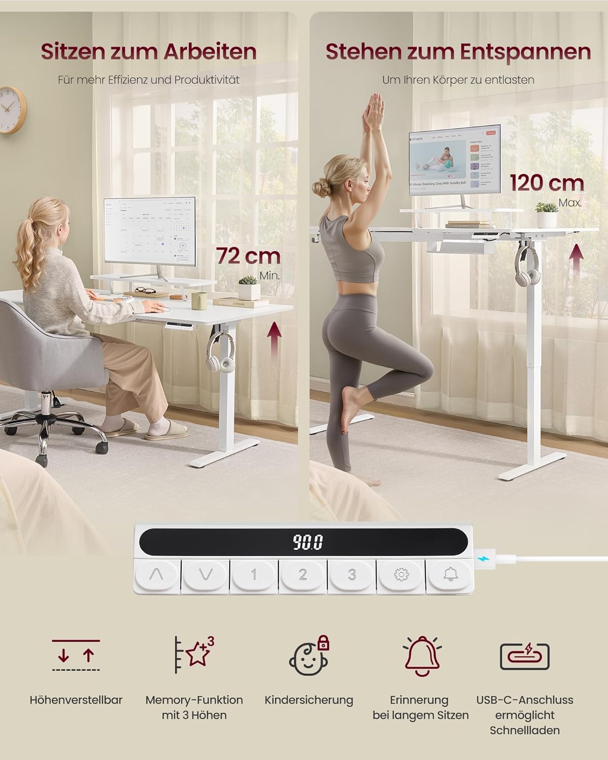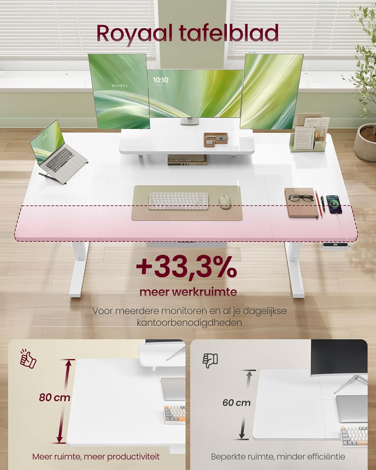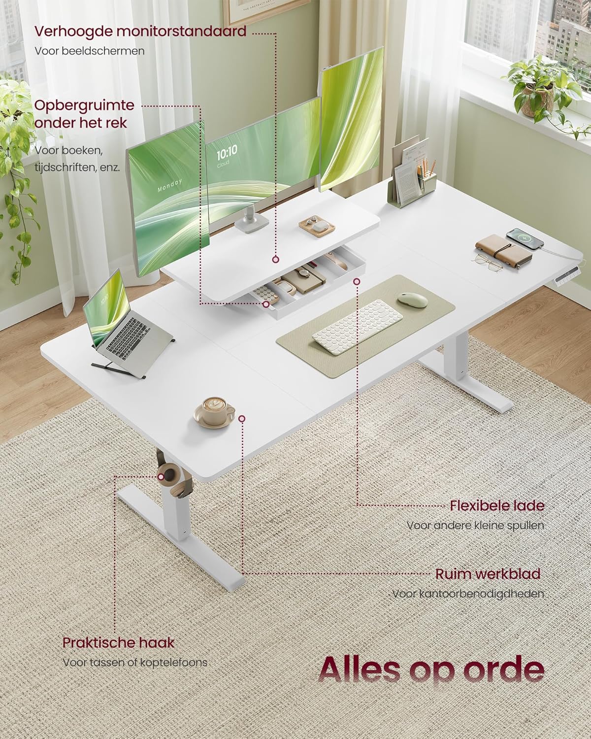 Dit in hoogte verstelbare bureau is uw perfecte werkpartner! Met een royaal tafelblad van 120 x 60 cm biedt het voldoende ruimte om uw productiviteit te verhogen. De hoogte van het bureau is verstelbaar van 72 tot 120 cm, zodat u naar behoefte kunt wisselen tussen zittend en staand werken om de optimale werkhouding te vinden. De geheugenfunctie met 4 hoogte-instellingen zorgt ervoor dat u uw voorkeurshoogte kunt opslaan. Het stevige stalen frame en de hoogwaardige motor zorgen ervoor dat het bureau soepel en snel omhoog en omlaag gaat, terwijl het geluidsniveau lager is dan 48 dB, zodat u zich ongestoord op uw werk kunt concentreren. Twee kabeldoorvoeren, een USB-poort, organizer en haken zorgen voor het netjes opbergen van uw werkspullen.