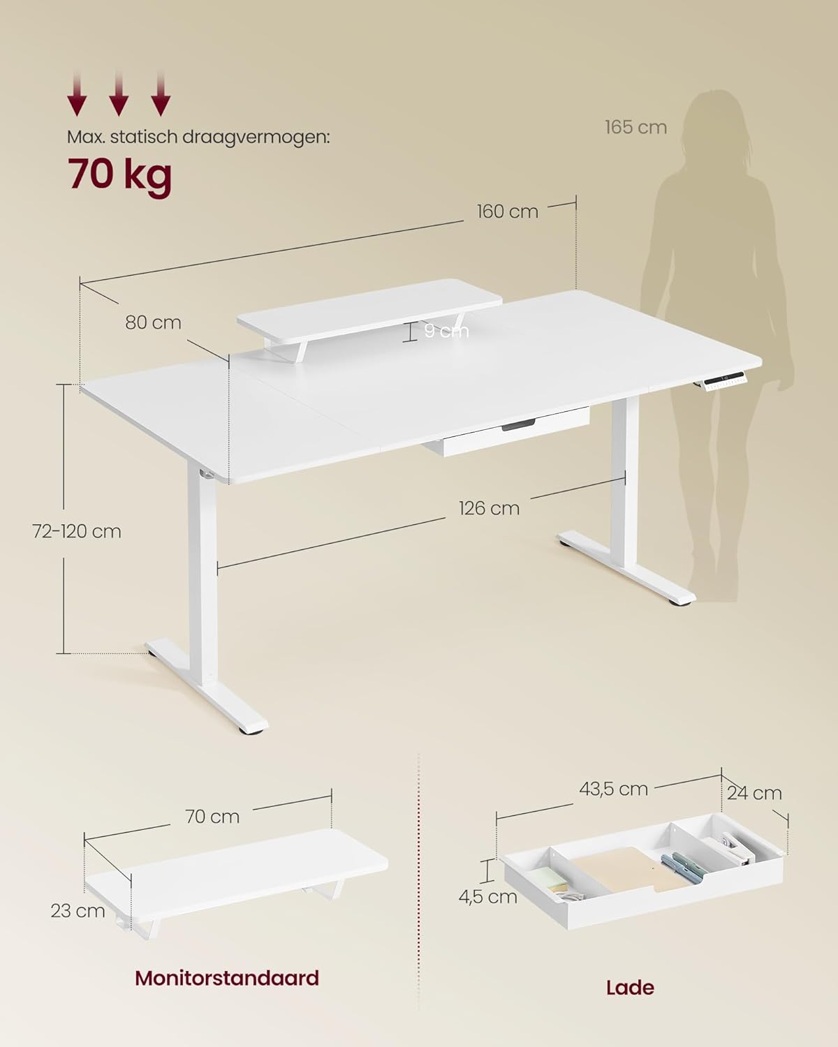 Zit sta bureau 160×80 cm – hoogte verstelbaar 72 t/m 120 cm – elektrisch – wit – LSD156WB01