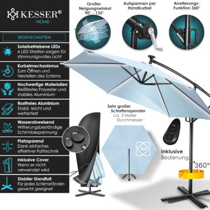 Uw ideale metgezel voor de zomer, robuust, UV-bescherming, inclusief beschermhoes, verstelbare kantelhoek, LED-verlichting en zwengelmechanisme voor openen en sluiten.