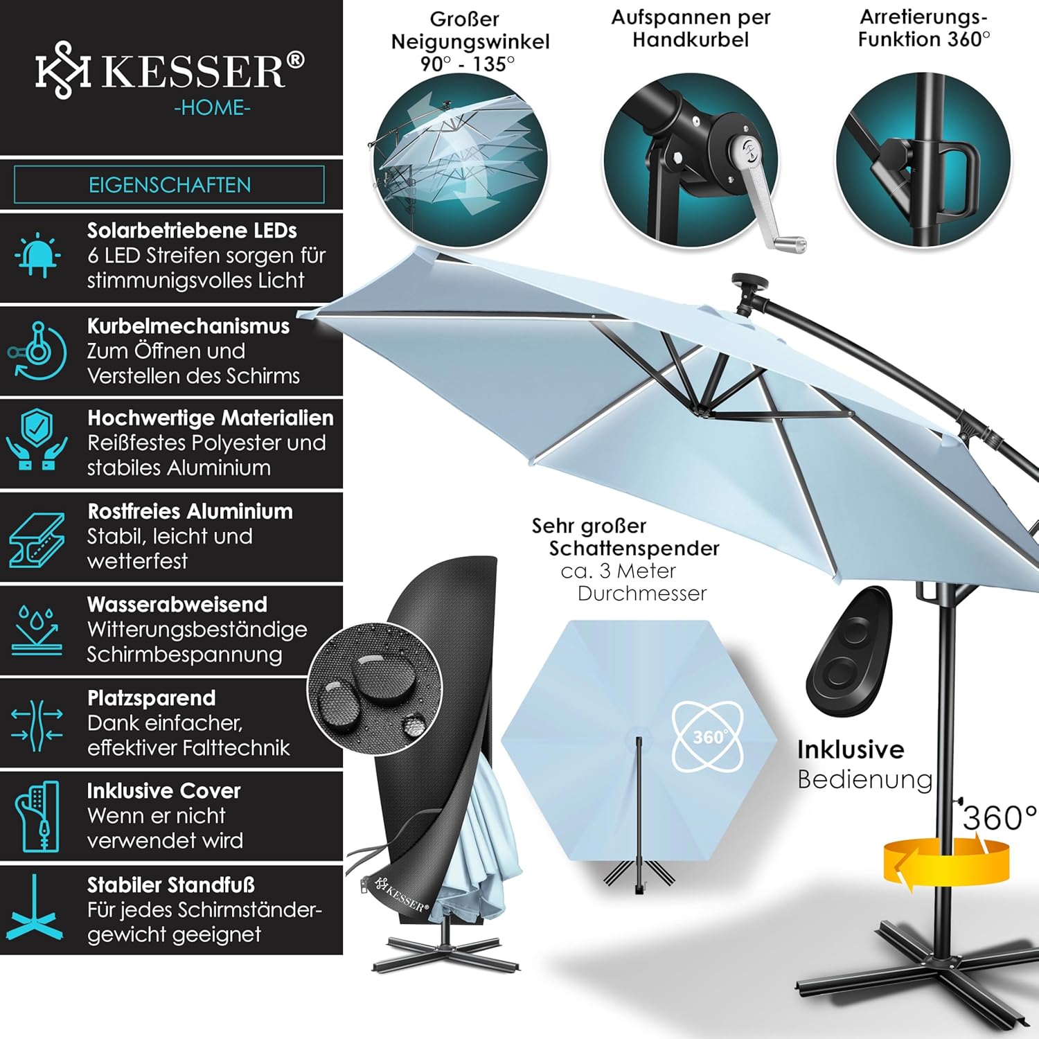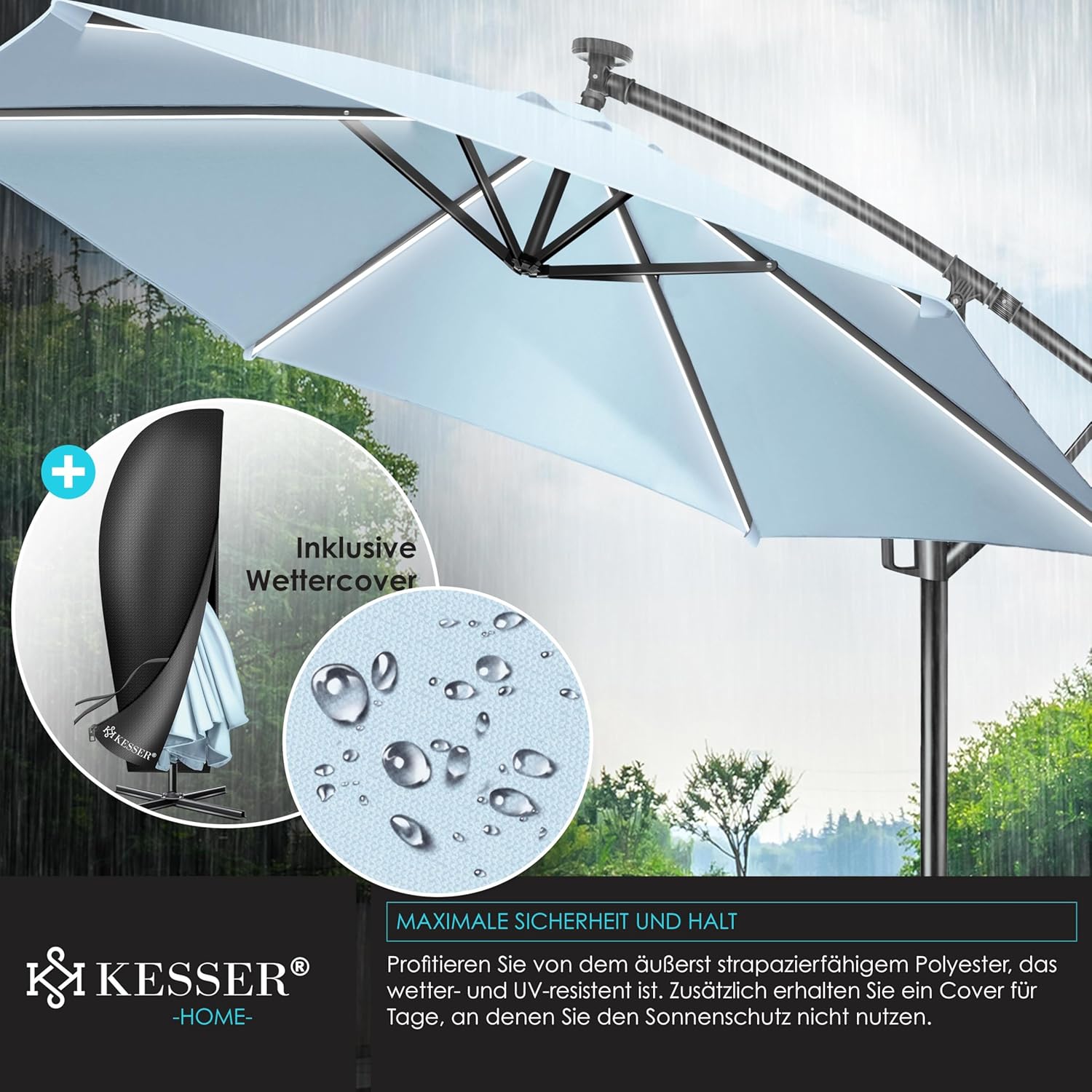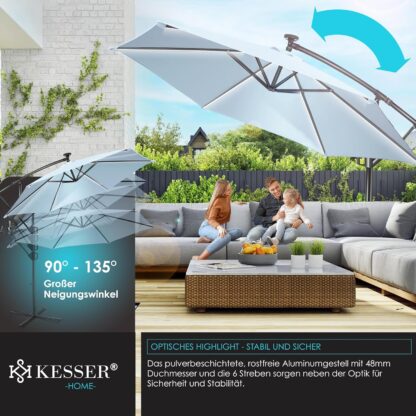 ROBUUST & VEILIG: Een robuuste mast van lichtgewicht en roestvrij aluminium met een diameter van 48 mm zorgt voor stabiele ondersteuning, en 6 baleinen zorgen voor extra stabiliteit. Bovendien kan de parasol op het voetkruis worden verzwaard met de bijpassende KESSER parasolvoet om bestand te zijn tegen wind en weer. Het schermdoek is gemaakt van 100% polyester en is waterafstotend, zodat u de parasol ook bij regen kunt gebruiken.