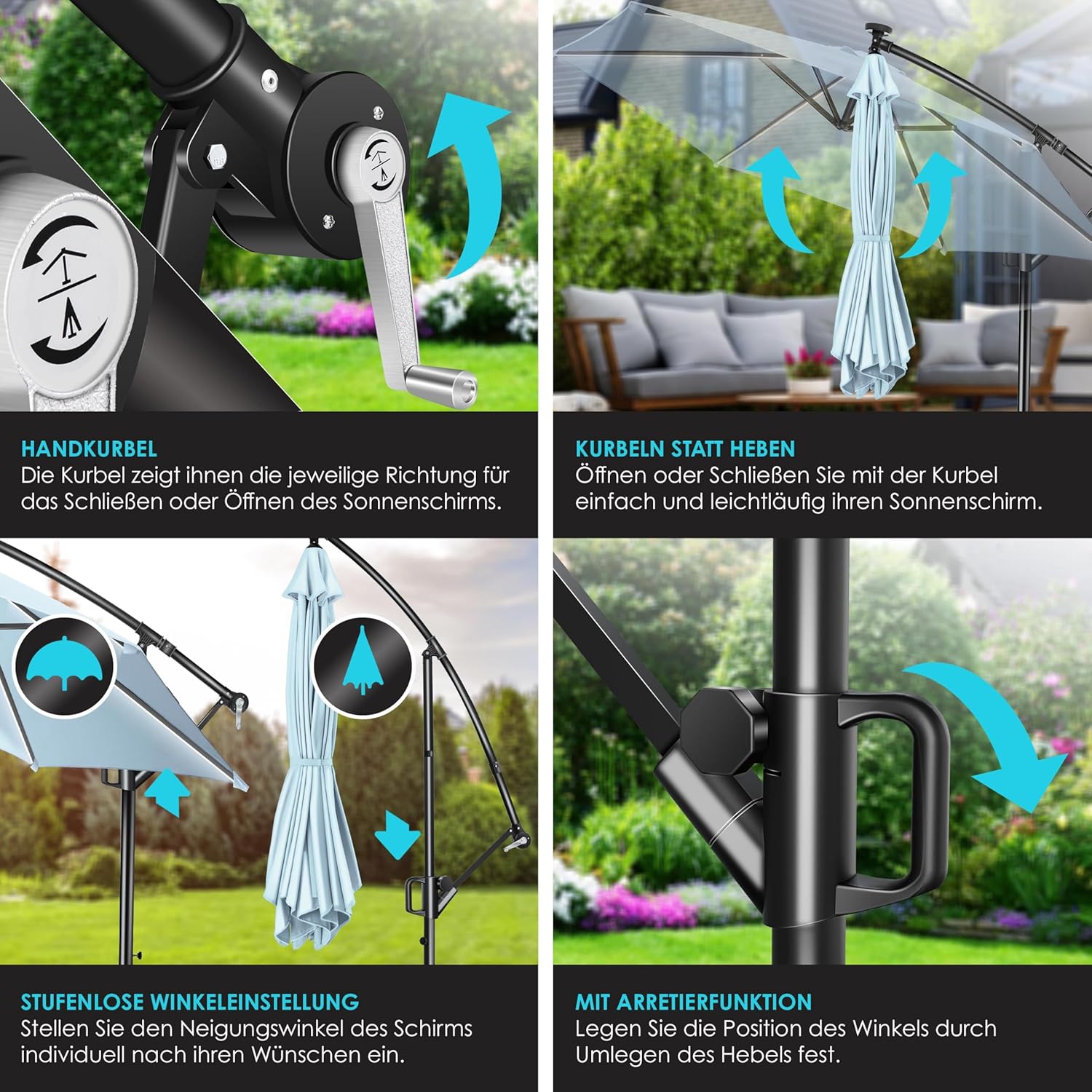 ZWENGELSYSTEEM: Met het geïntegreerde zwengelsysteem kunt u de parasol eenvoudig openen en sluiten met de soepel lopende slinger. Zo heeft u uw parasol in enkele seconden gespannen en kunt u van de zomer genieten – draaien in plaats van tillen.