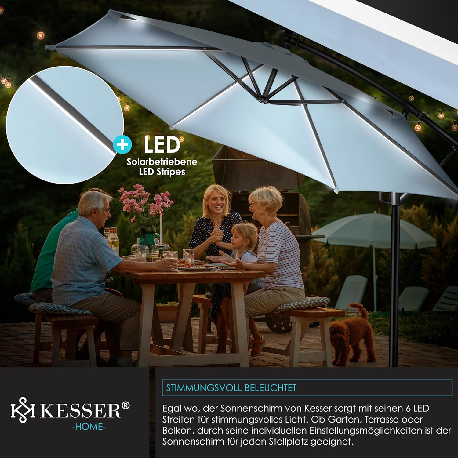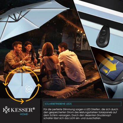 LED-VERLICHTING: Door de 24 LED-lampen ontstaat er op langere zomeravonden sfeervol licht voor een aangename ambiance. De LED-lampen worden gevoed door een krachtig zonnepaneel, dat is gemonteerd op de top van de parasol. Met de discrete Aan/Uit-drukknopschakelaar kan het licht eenvoudig worden bediend.