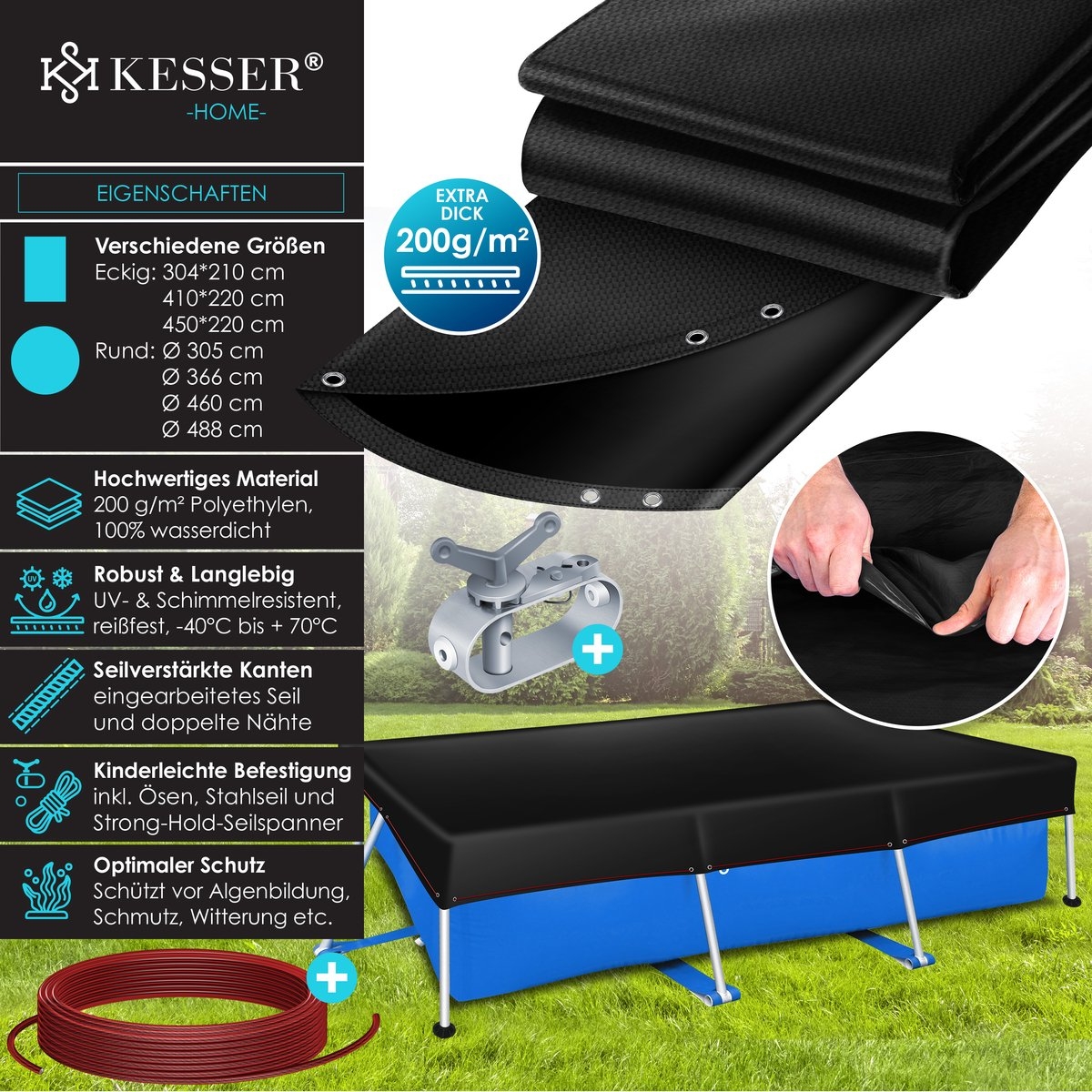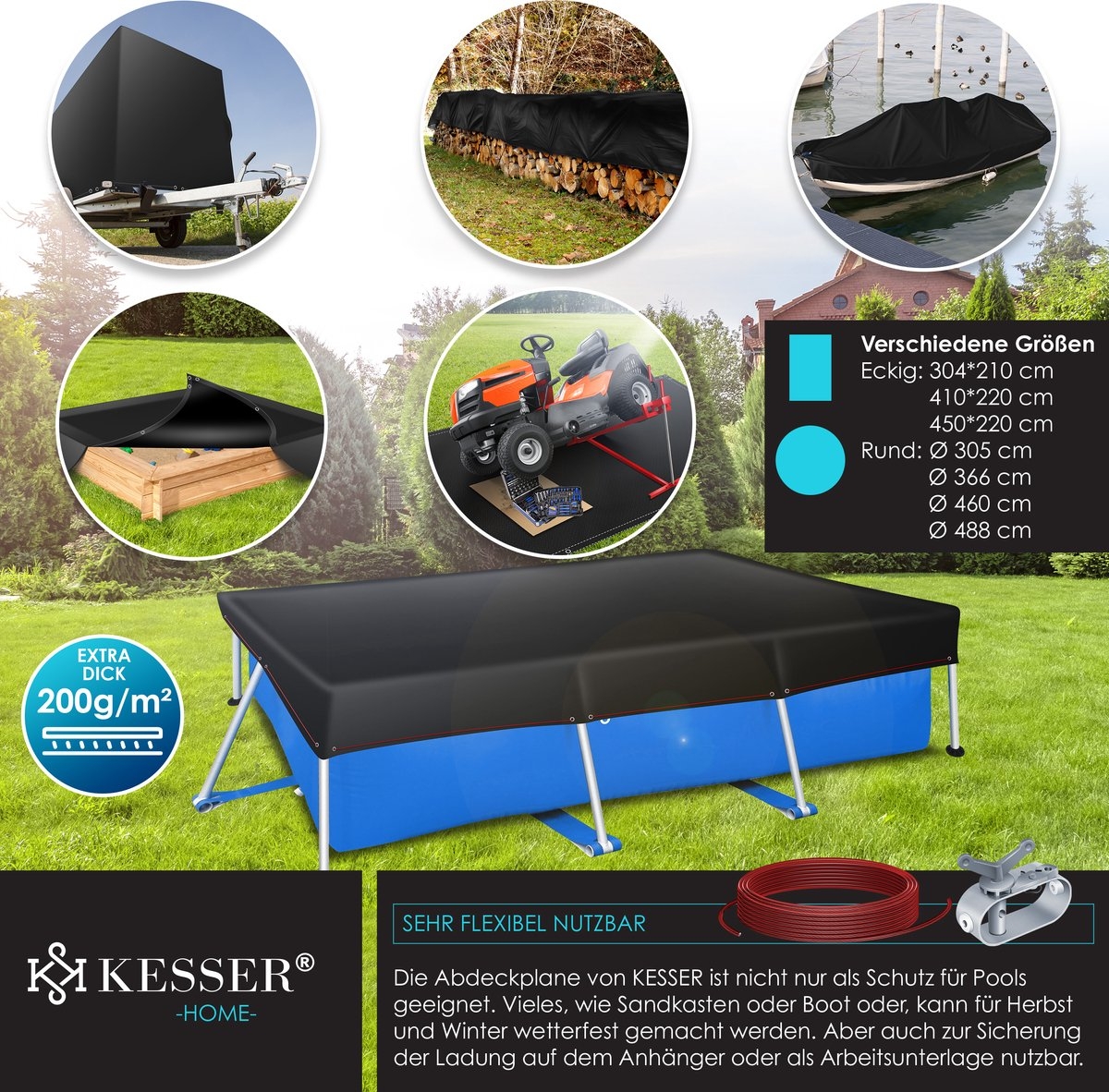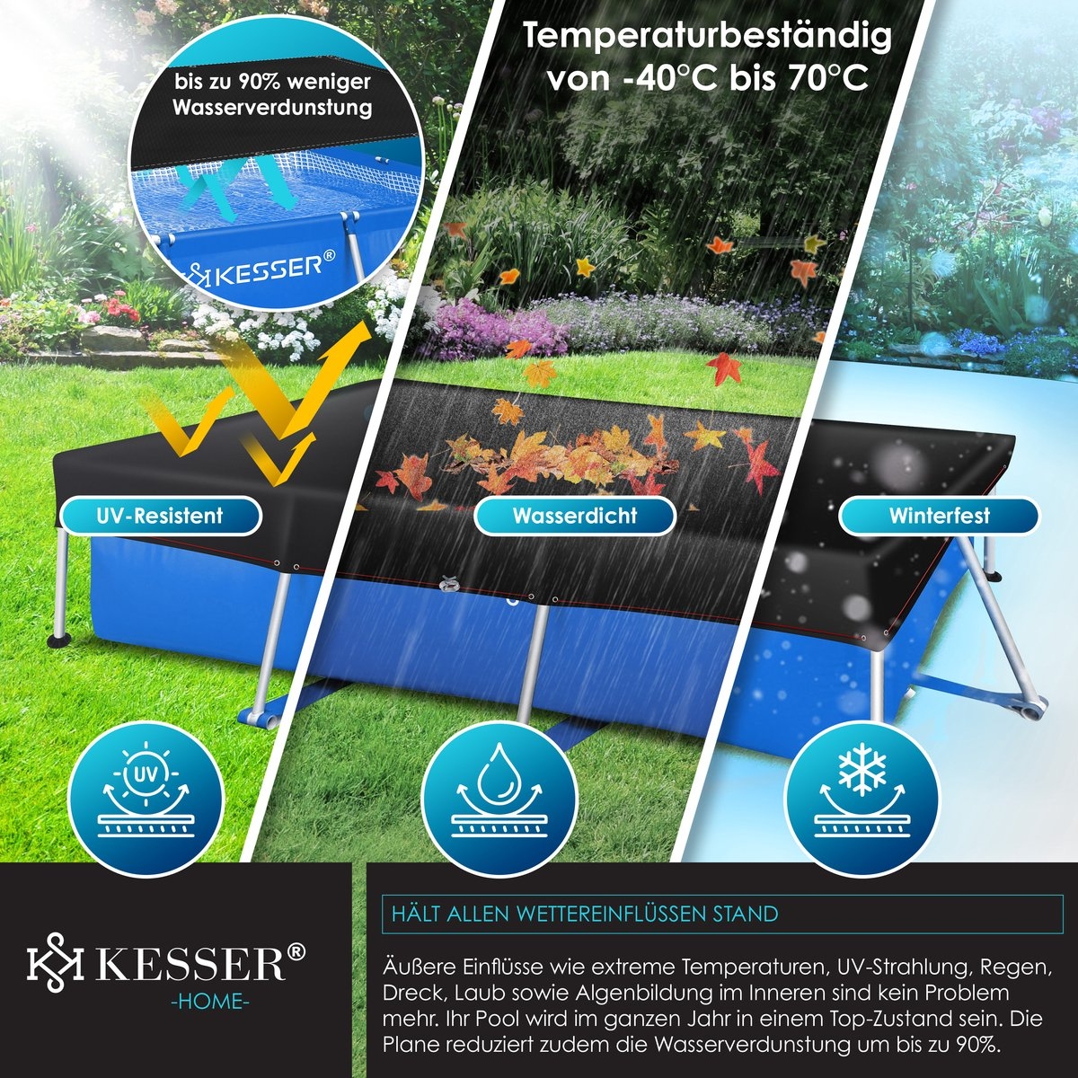 BESCHERMT ELK ZWEMBAD: Onze zwembadafdekking van KESSER is een onmisbaar accessoire voor elke zwembadeigenaar. Het beschermt het water tegen onzuiverheden, weersinvloeden en vermindert de waterverdamping tot 90%, waardoor u minder water hoeft bij te vullen. De regenhoes is verkrijgbaar in verschillende maten om te voldoen aan de behoeften van zwembaden van elke grootte.
