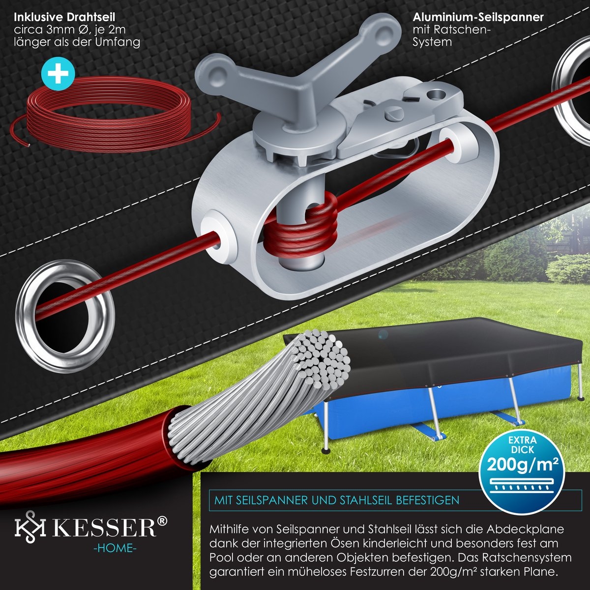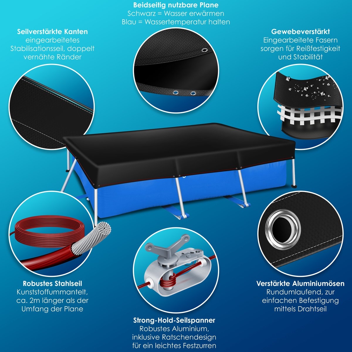 Zwembadafdekking waterdicht dankzij hoogwaardig materiaal, incl. oogjes, staalkoord en strong-hold touwspanner, UV- en schimmelbestendig, scheurvast en temperatuurbestendig van -40°C tot +70°C.