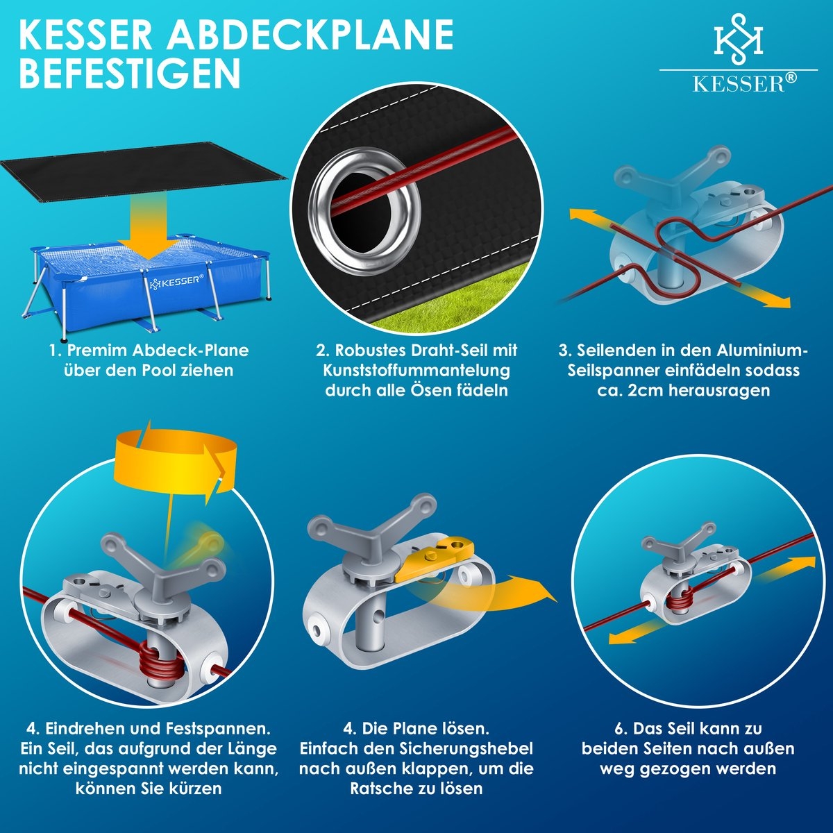 EASY TO INSTALL: De afdekking wordt gewoon over het zwembad getrokken en de robuuste staalkabel met plastic coating wordt door alle oogjes van de afdekking gehaald. De uiteinden van de kabel worden dan in de koordspanner gestoken. Het touw wordt ingedraaid en strak gespannen. Als een touw niet gespannen kan worden omwille van de lengte, kan het gewoon ingekort worden. De afdekking kan op elk moment losgemaakt worden door de veiligheidshendel naar buiten te draaien om de ratel los te maken.