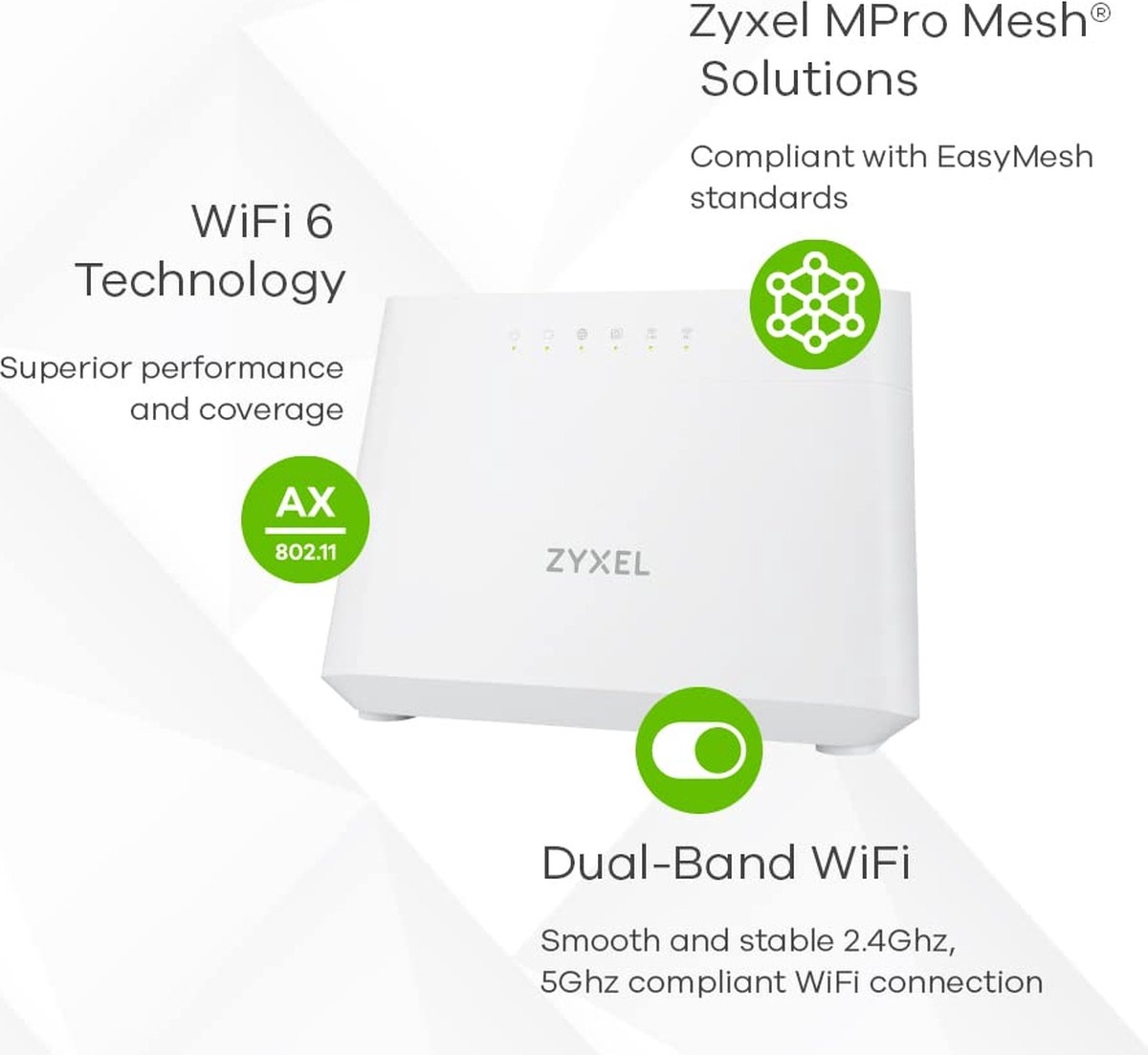 Zyxel DX3301-T0. Wifi-band: Dual-band (2.4 GHz / 5 GHz), Wifi-standaard: Wi-Fi 6 (802.11ax), Wi-Fi-standaarden: Wi-Fi 6 (802.11ax). Interfacetype Ethernet LAN: Gigabit Ethernet, Ethernet LAN, data-overdrachtsnelheden: 1000 Mbit/s, Netwerkstandaard: IEEE 802.1Q. Stemcodecs: G.711a, G.722, G.726, G.729. Type product: Router om neer te zetten, Kleur van het product: Wit, LED-indicatoren: LAN, Stroom, WAN, WLAN, WPS. Antenne-ontwerp: Intern